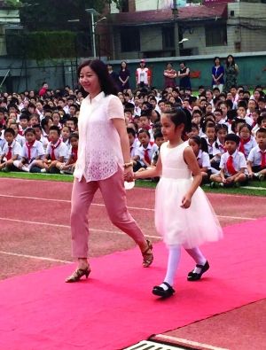 南京市鼓楼区第一中心小学举行教师表彰会,一年级的小朋友牵着18位优秀老师走红地毯