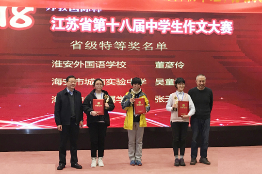 江苏省中学生作文大赛是经江苏省教育厅批准的十项中小学竞赛活动之一,今年的大赛7月下旬启动,全省各地60多万名初中生参加。经过初赛、复赛,12月22日的现场决赛,616名选手同场竞技,决赛赛题为“冬季快乐”“沿线”和一道由诗歌《赋得古原草送别》引出的发散性题目。淮安外国语学校的董彦伶等20名选手获特等奖。