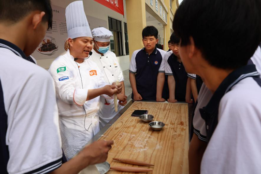 烹饪文化讲座向同学们介绍了中国烹饪的发展、解读了烹饪文化内涵。在中式面点技能展示与勺工技能训练版块,老师为同学们进行勺工技能操作的讲解与示范,并带领同学们动手操作。
