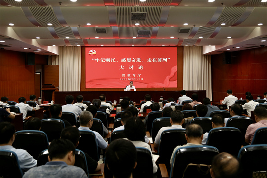 7月12日,省教育厅开展“牢记嘱托、感恩奋进、走在前列”大讨论,组织党员干部在深入学习贯彻习近平新时代中国特色社会主义思想的基础上,重点围绕习近平总书记在中共中央政治局第五次集体学习和在江苏考察时的重要讲话重要指示精神,结合工作实际开展讨论交流。省教育厅厅长、党组书记、省委教育工委书记、厅主题教育领导小组组长江涌主持会议。省委主题教育第九巡回指导组副组长杭坚到会指导。