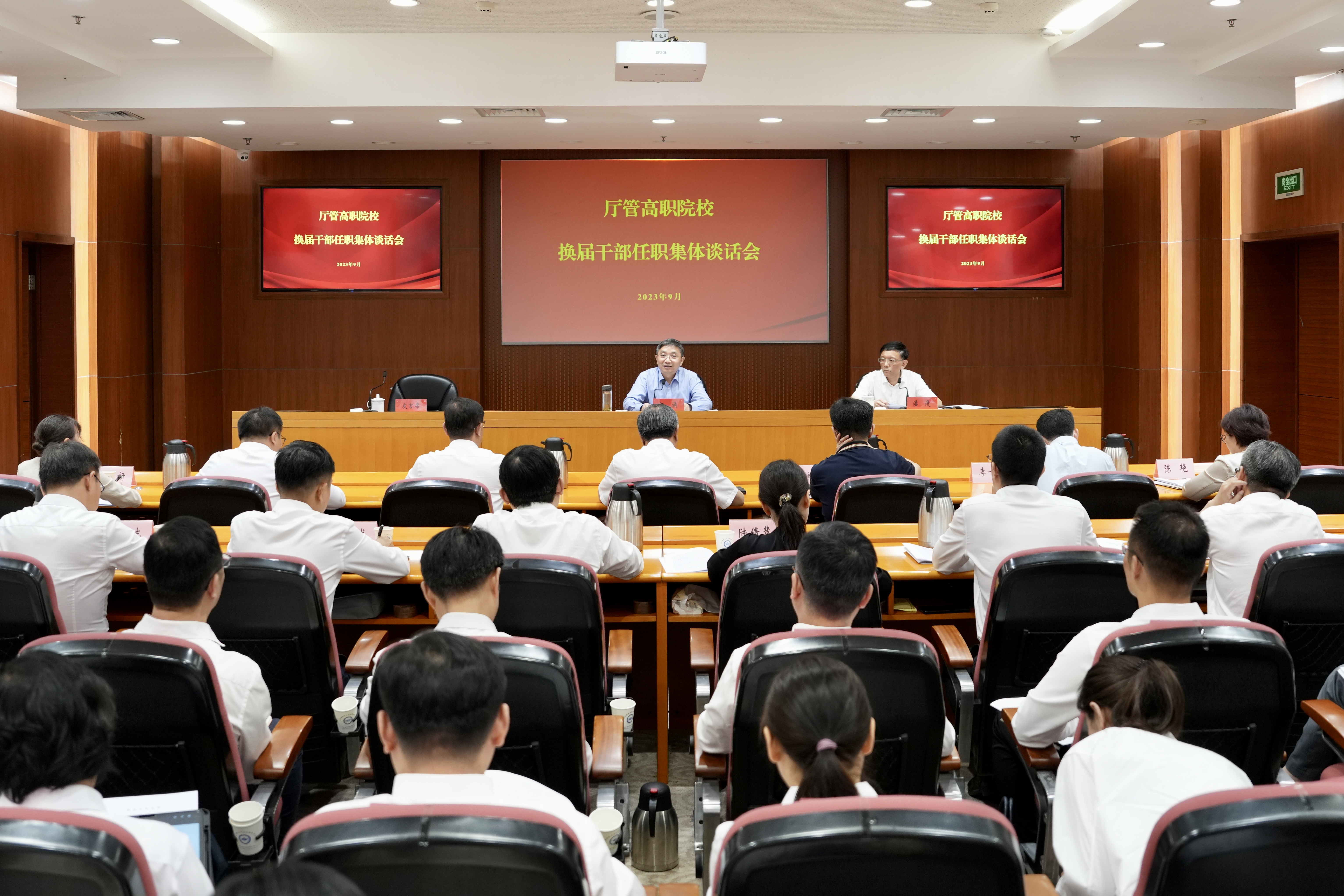 9月4日,省委教育工委召开厅管高职院校换届干部任职集体谈话会。省教育厅厅长、党组书记,省委教育工委书记江涌出席会议并讲话,省委教育工委副书记、省教育厅党组成员潘漫主持会议。