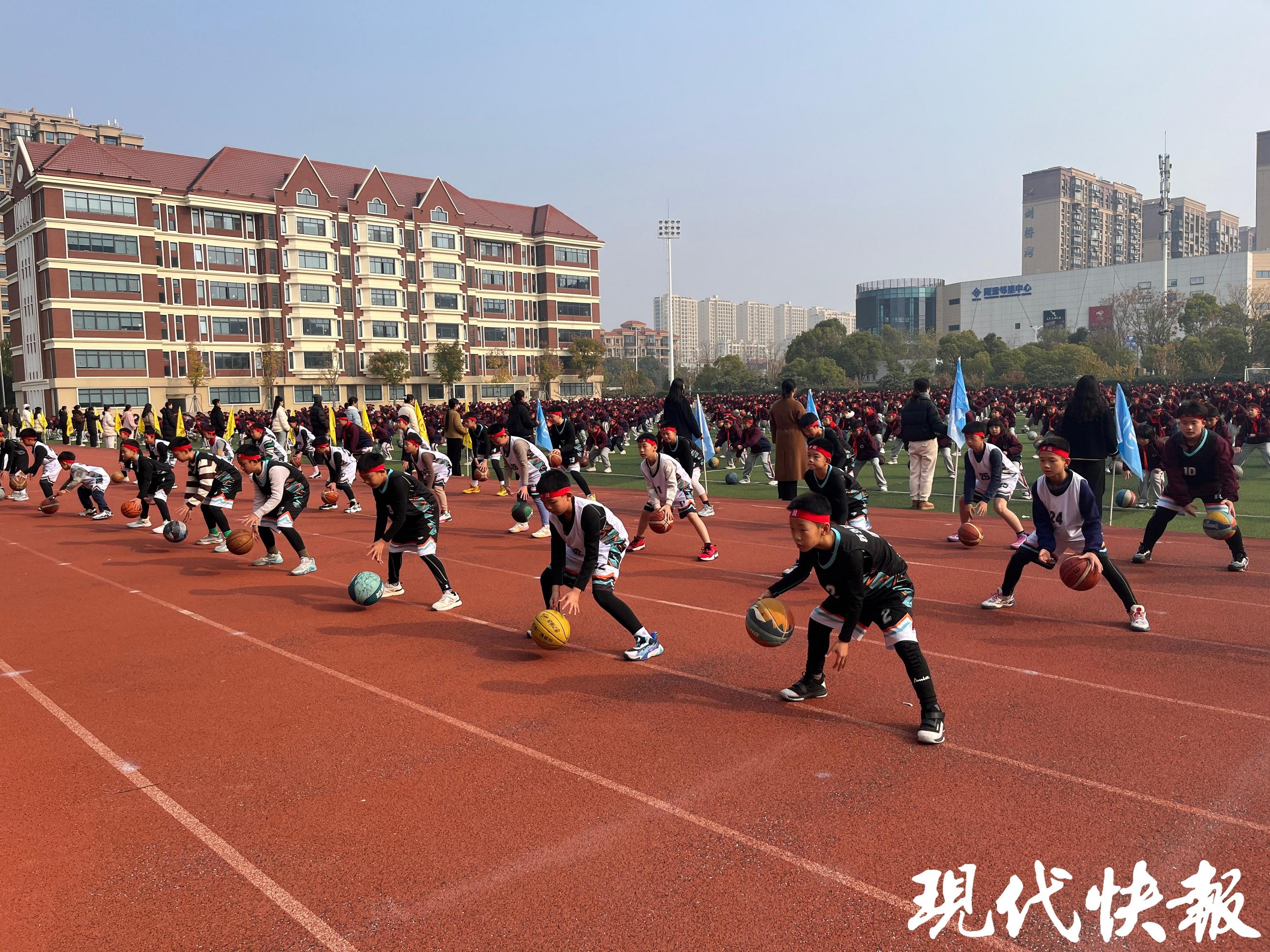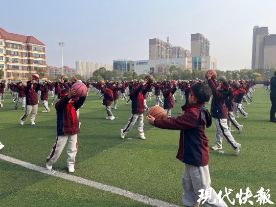 宿迁市苏州外国语学校南校区操场上,孩子们变身“篮球小将”,头戴发带、身穿背心,精神昂扬地跟着节奏做起篮球操。