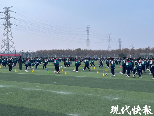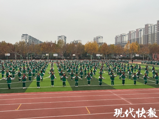 在宿迁经济技术开发区三棵树小学,学生在操场上伴随着音乐进行足球三项活动、足球训练。学校将足球融入大课间活动,建立班级、年级、校级三级足球队,推动全员足球普及。学校还根据学生的年龄特点,充分利用学校活动区域开展丰富多彩的阳光课间活动。