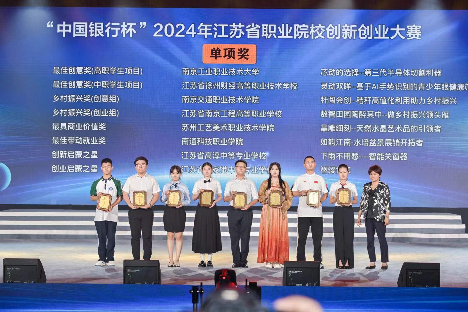 为深入学习贯彻党的二十届三中全会精神、习近平总书记关于教育的重要论述和给“青年红色筑梦之旅”大学生重要回信精神,培养职业院校学生的创新精神和创业能力,江苏省教育厅等9家单位共同主办2024年“中国银行杯”江苏省职业院校创新创业大赛,历经市校级初赛、省级复赛和省级决赛,7月31日晚,大赛冠军争夺赛暨颁奖典礼在南京交通职业技术学院举行。