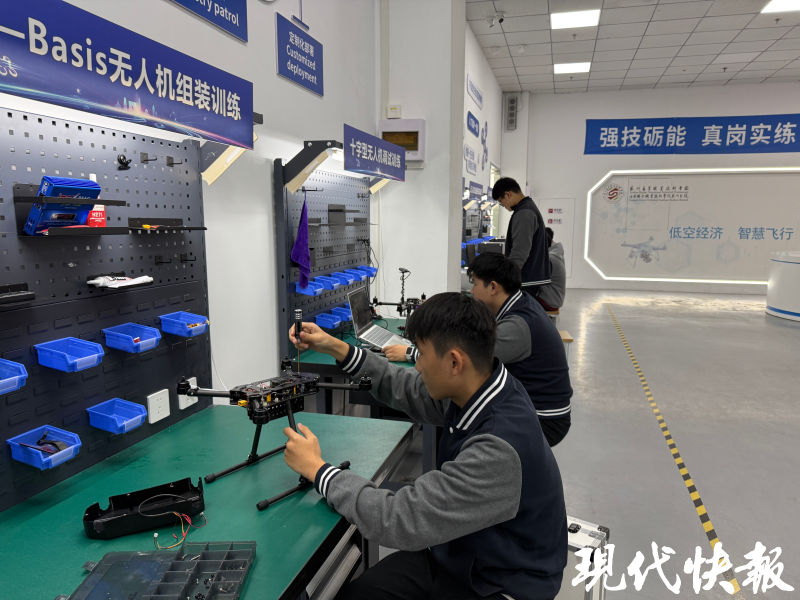 “无人机足球操控是我们课堂的一个延伸”,电子工程系主任田小强介绍,2018年学校就开设了无人机社团,自2021年起与苏州农业职业技术学院开设无人机操控与维护专业“3+3”联合培养项目,建立无人机装调检修实验室、无人机虚拟实训室、无人机室内飞行室等校内实训基地,全面加强低空经济人才培养体系建设。学校紧扣苏州“1030”产业体系,精准对接低空经济发展要求,进一步加强产教融合、校企合作。