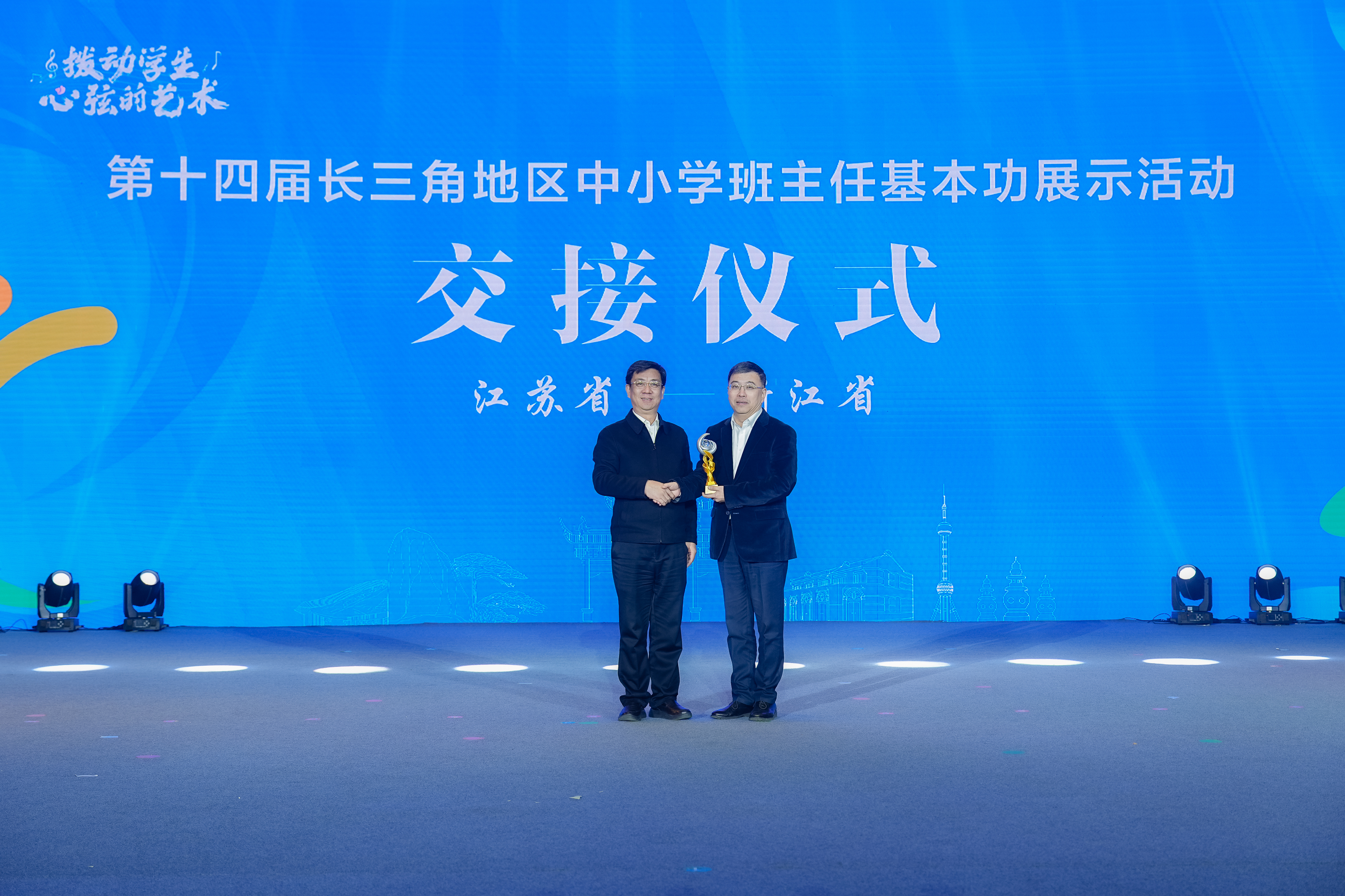 本次活动分小学组、初中组、高中组三个组别,设置育人故事、带班育人方略、主题班会、情境模拟四大板块,全方位考察班主任的思想引领能力、班级管理智慧、应急处置水平与人文关怀素养。闭幕式上,江苏班主任风采展示环节成为活动亮点。从教育世家的百年情怀到历届班主任基本功选手的别样组合,再到以紫砂匠心为隐喻的《心“壶”》和以“全国教书育人楷模”李庾南老师感人事迹改编的《人是要有点精神的》两台情景剧,“坚守”的温度与“传承”的力量一脉相承。活动最后举行了交接仪式,江苏省教育厅与浙江省教育厅完成会杯交接。