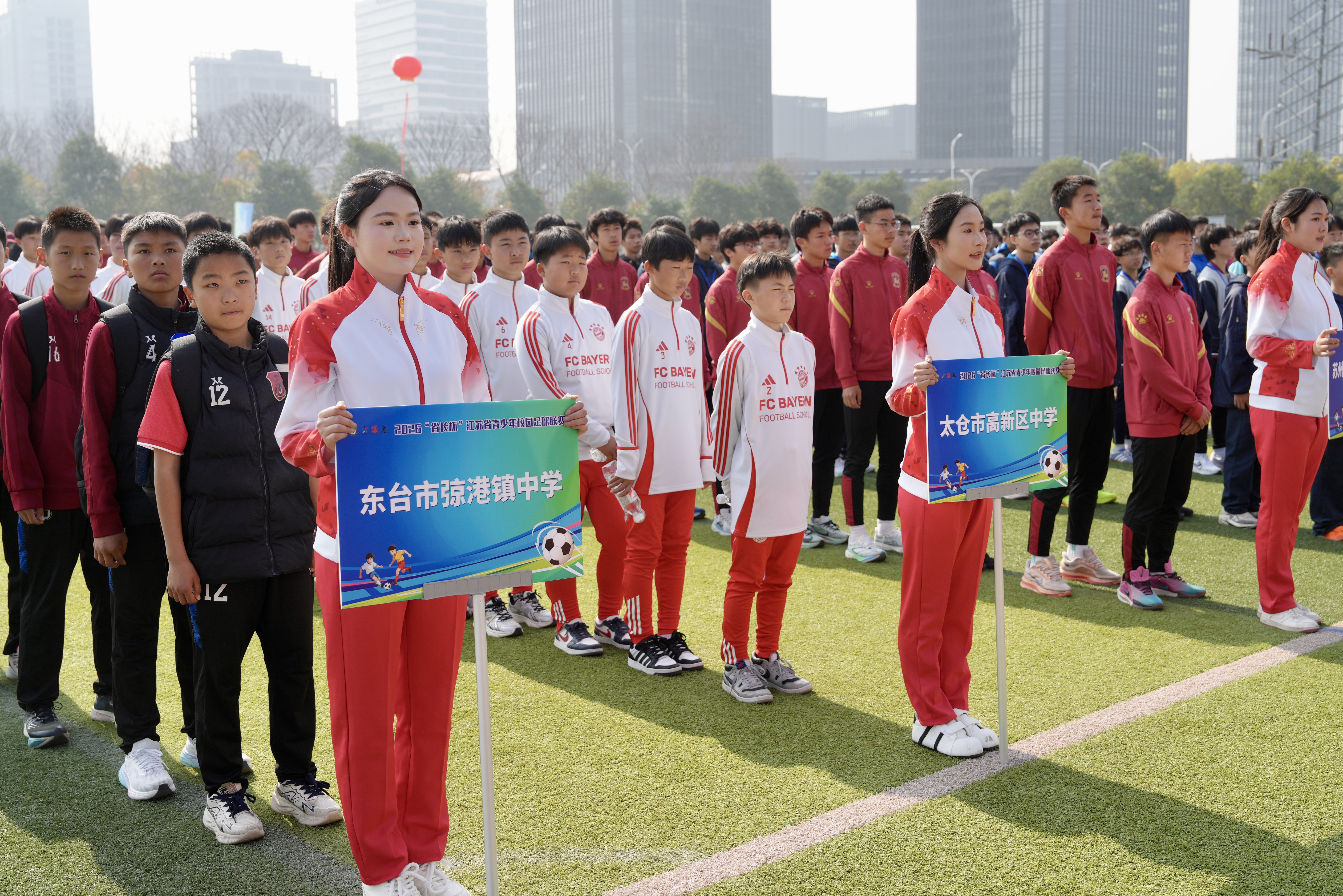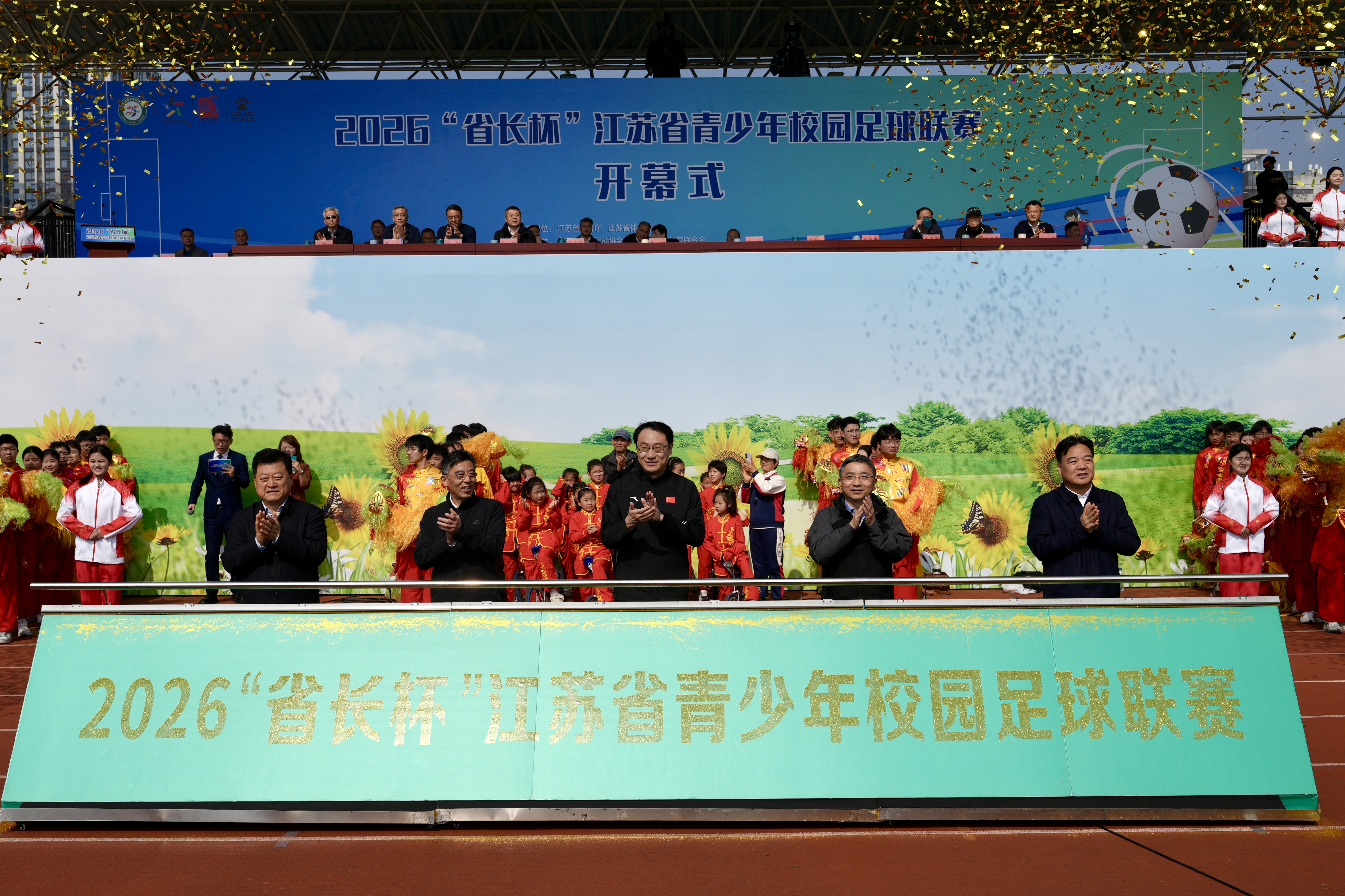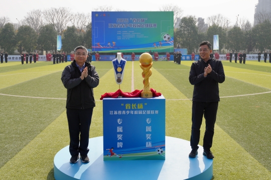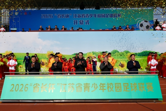 副省长赵岩,省教育厅厅长、省委教育工委书记江涌,省体育局局长陈少军,南京市委常委、江北新区党工委书记、浦口区委书记陆卫东,南京市副市长孙百军等共同推杆,正式宣布2026“省长杯”江苏省青少年校园足球联赛开幕。
