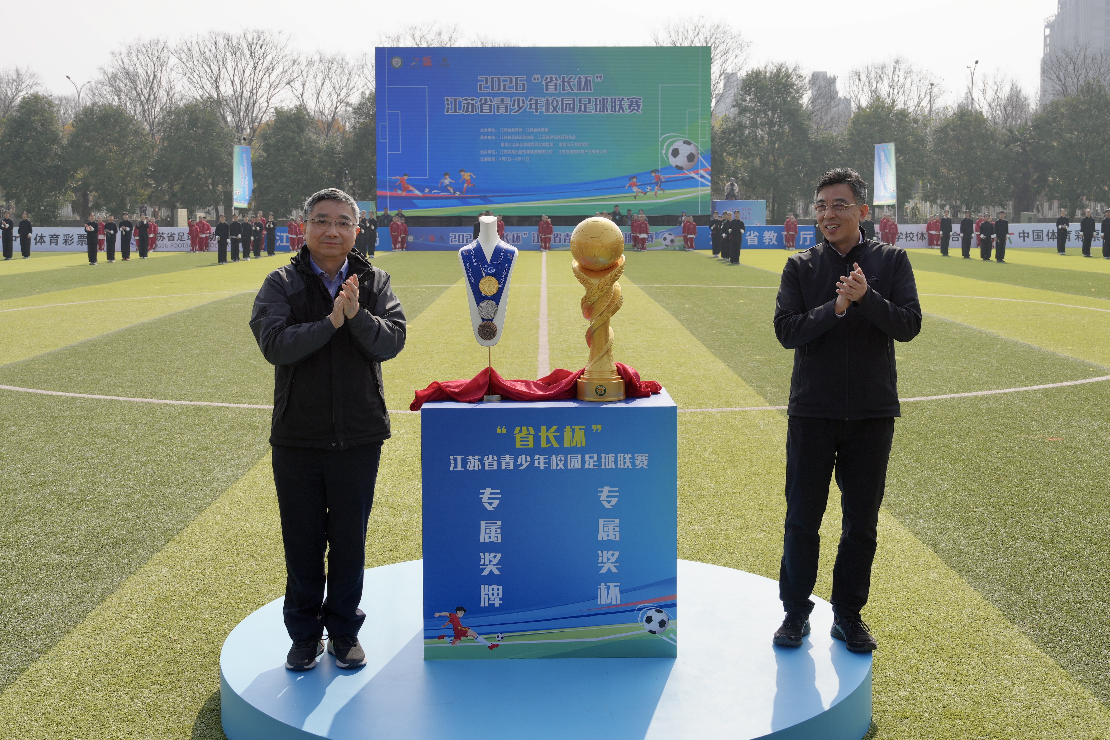 值得关注的是,2026“省长杯”迎来全新里程碑,省教育厅厅长、省委教育工委书记江涌,省体育局局长陈少军共同为全新设计的“省长杯”联赛奖杯、奖牌揭幕。奖杯定名“共创”,融合江苏水文化与校园足球育人理念,以水韵为基、桃李为脉、新芽为势、足球为冠,象征团结拼搏、共创共赢;奖牌定名“水韵”,水波纹样寓意江苏各地青少年的拼搏汗水凝结荣耀,绶带饰以云锦水样暗纹,尽显传统与现代融合的江苏韵味。全新奖杯奖牌的亮相,也让江苏省青少年校园足球荣誉体系进一步丰满完善。
