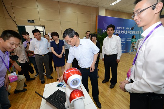 曹卫星副省长参观了2015年江苏省大学生科技创新成果展。参观过程中,曹卫星副省长与参赛学校学生进行了交流,向他们详细询问了创业项目的产品制作原理、产品性能、关键技术和创新点,并勉励参赛选手要勤于思考,积极参与科技创新活动,不断提高创新能力、实践动手能力及科技创新成果转化的能力。