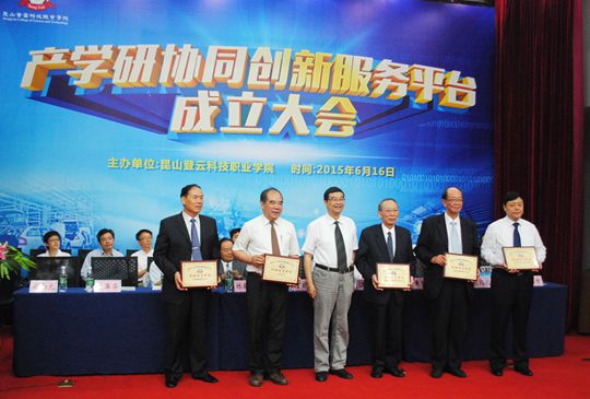 昆山登云科技职业学院产学研协同创新服务平台是该学院发挥董事会背景优势,通过邀集高校、科研以及众多合作企业来促进产业转型升级、培育精英高技能人才的平台。该平台将对外提供技术技能型人才合作培养、标准化认证与辅导、两岸技能人才培训体系开发与建设、产业转型升级项目合作、智慧财产增值、企业间业务商机整合等服务。参加该会议的还有台湾成功大学、明新科技大学、台湾侨福泡棉集团、台湾拓凯复合材料集团以及东南大学和江苏海事职业技术学院的负责人。昆山市政府、苏州市国际教育园区以及昆山市有关部门负责人也出席会议。