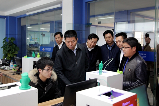 洪流一行重点参观了该校的机加工实训中心、新能源应用实训基地、国家级汽车实训基地、校企合作人才展以及3D打印研究所,并与现场的师生进行深入交流。洪流一行听取了学院升本后的办学情况和该院在精密制造及系统、3D打印技术、机器人应用技术和数控刀具智能制造等技术项目建设方面的情况汇报。