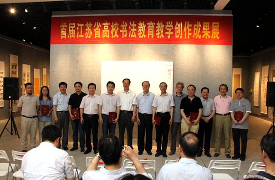 为进一步推动我省高校书法教育事业发展,为广大师生搭建展示书法才华的平台,6月20日,江苏省教育书法协会、江苏省高等教育学会、江苏省艺术教育指导委员会在南京师范大学联合举行首届江苏省高校书法教育教学创作成果展。国家教育咨询委员会成员、国家教材评审委员会主任委员、教育部原副部长、江苏省原副省长、江苏省教育书协名誉会长王湛,江苏省原副省长、省政协原副主席张九汉,省政协原副主席、南京艺术学院原院长冯健亲等出席开幕式,省教育厅副厅长、省教育书协常务副会长兼秘书长丁晓昌发表讲话。南京师范大学校长胡敏强致欢迎辞,省教育基金会理事长、省教育书协副会长祭彦加主持开幕式,省政协常委、医卫体委员会主任、省政府原副秘书长、省教育书协会长李一宁,省委宣传部部务委员李朝润,全国政协委员、中国书协顾问、第六届副主席、东南大学中国书法研究院院长言恭达,全国政协委员、省书协副主席、江苏省书法创作研究中心主任徐利明,以及获得优秀组织奖高校负责同志、省书协负责同志、省内20余所高校的美术(艺术)学院主要负责同志出席开幕式。