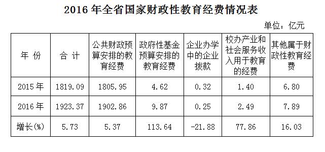 (一)2016年全省国家财政性教育经费(主要包括公共财政预算安排的教育经费、政府性基金预算安排的教育经费、企业办学中的企业拨款、校办产业和社会服务收入用于教育的经费等)1923.37亿元,比上年增加104.28亿元,增长5.73%。其中,公共财政预算安排的教育经费1902.86亿元,占98.93%;政府性基金预算安排的教育经费9.87亿元,占0.51%;企业办学中的企业拨款0.25亿元,占0.01%;校办产业和社会服务收入用于教育的经费2.49亿元,占0.13%;其他属于财政性教育经费7.89亿元,占0.41%(详见下表)。