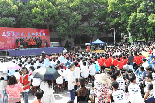 张家港工贸职业高级中学阳光课间活动展示时间,学校近两千名学生按班排成方队,从不同路径,在班牌的引领下步伐整齐,小步跑向操场。队列整齐、口号响亮的集体跑,动作规范、舒展大方的集体操,动感阳刚、活力四射的集体跳绳、俯卧撑和立卧撑,刚柔相济、轻灵缓慢的集体太极拳。整场活动获得在场家长的高度评价。