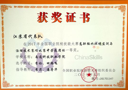 在5月14日结束的2017年全国职业院校技能大赛高职组“水环境监测与治理技术”决赛中,南通科技职业学院代表队荣获大赛团体一等奖第一名。南通科技职业学院创造了连续三届获得一等奖的好记录。