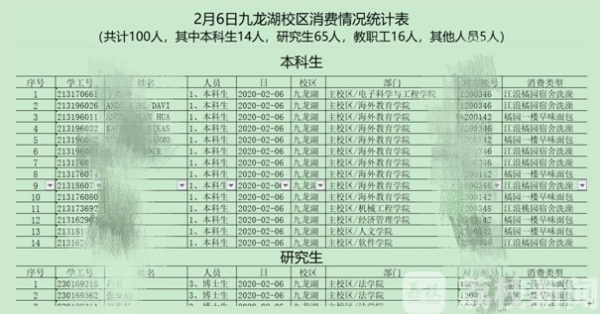东大利用各种科技手段,全方位助力学校疫情防控工作。在这份九龙湖校区消费情况统计表上,记录了2月6日这天共有100人在校园内消费,包括本科生、研究生、教职工及其他人员,购买早餐、宿舍洗澡等情况也一一详细记录下来。
