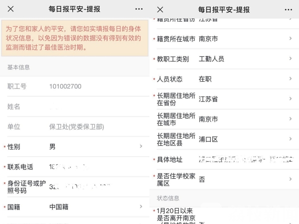 疫情发生后,东大率先面向全校教职工,及时推出了一款“疫情防控”App。打开主页面,在“防控疫情我们在一起”自助服务平台上,每个人除了要填写身份证号、长期居住地等基本信息外,还需要详细填写状态信息,具体包括1月20日以来是否离开南京,所去城市,离开日期,出行交通工具,是否途经重点地区,是否隔离,健康状况等信息,教职工每天都要通过这个APP进行上报。