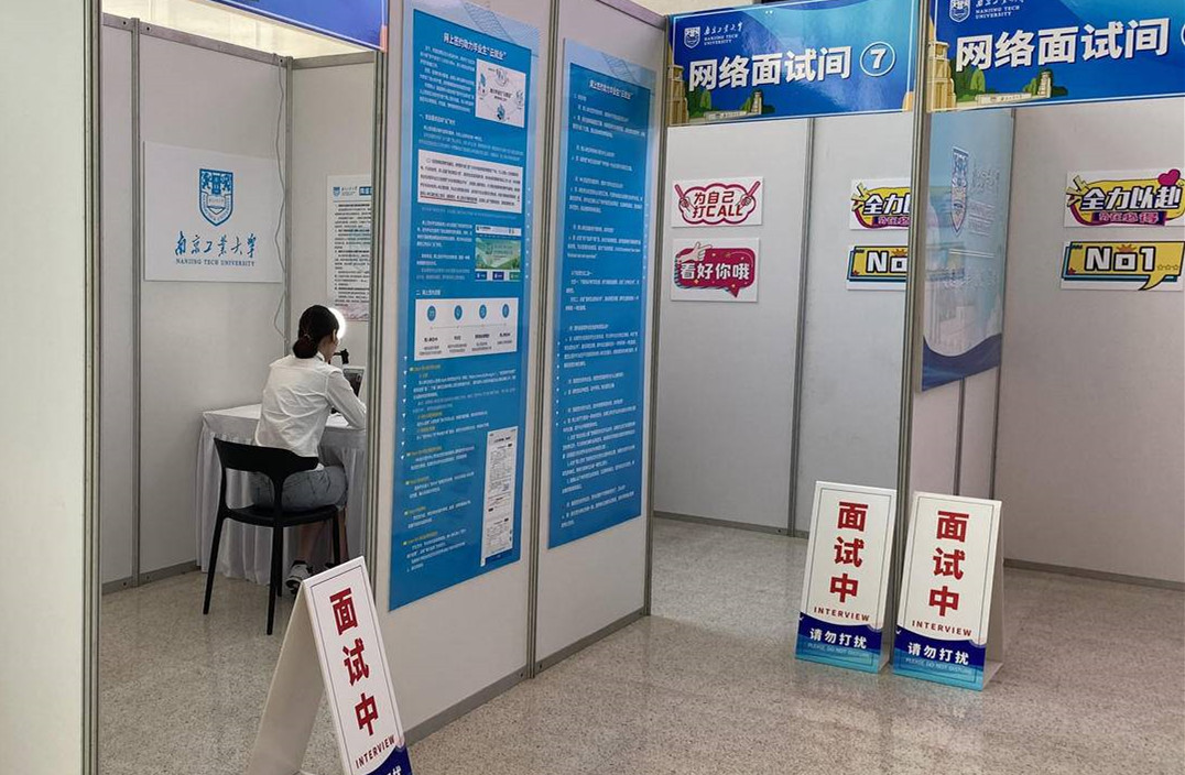 6日上午,记者走进南京工业大学弘毅楼二楼大厅,映入眼帘的就是10个整洁、明亮、安静且网络流畅的视频面试间和2个专用视频面试仓。每个面试间内都有着一位同学进行线上面试,面试间外,张贴着求职就业政策、招聘信息、网签流程等信息。记者注意到,在大厅内,还有多名校园志愿者为面试的同学提供服务。