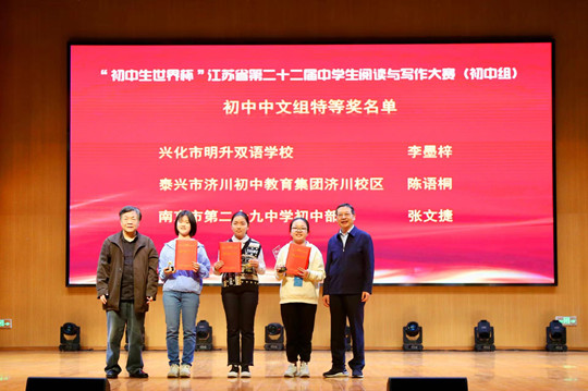 江苏省中学生阅读与写作大赛是省教育厅审核通过的全省中小学生竞赛活动项目之一。初中组竞赛由江苏教育报刊总社初中生世界编辑部具体承办。本届大赛于2022年10月启动,全省各地60多万名初中生参加,经过县(市、区)初赛、设区市复赛,964名选手进入现场决赛。评出中文组特等奖20名,英文组特等奖10名。