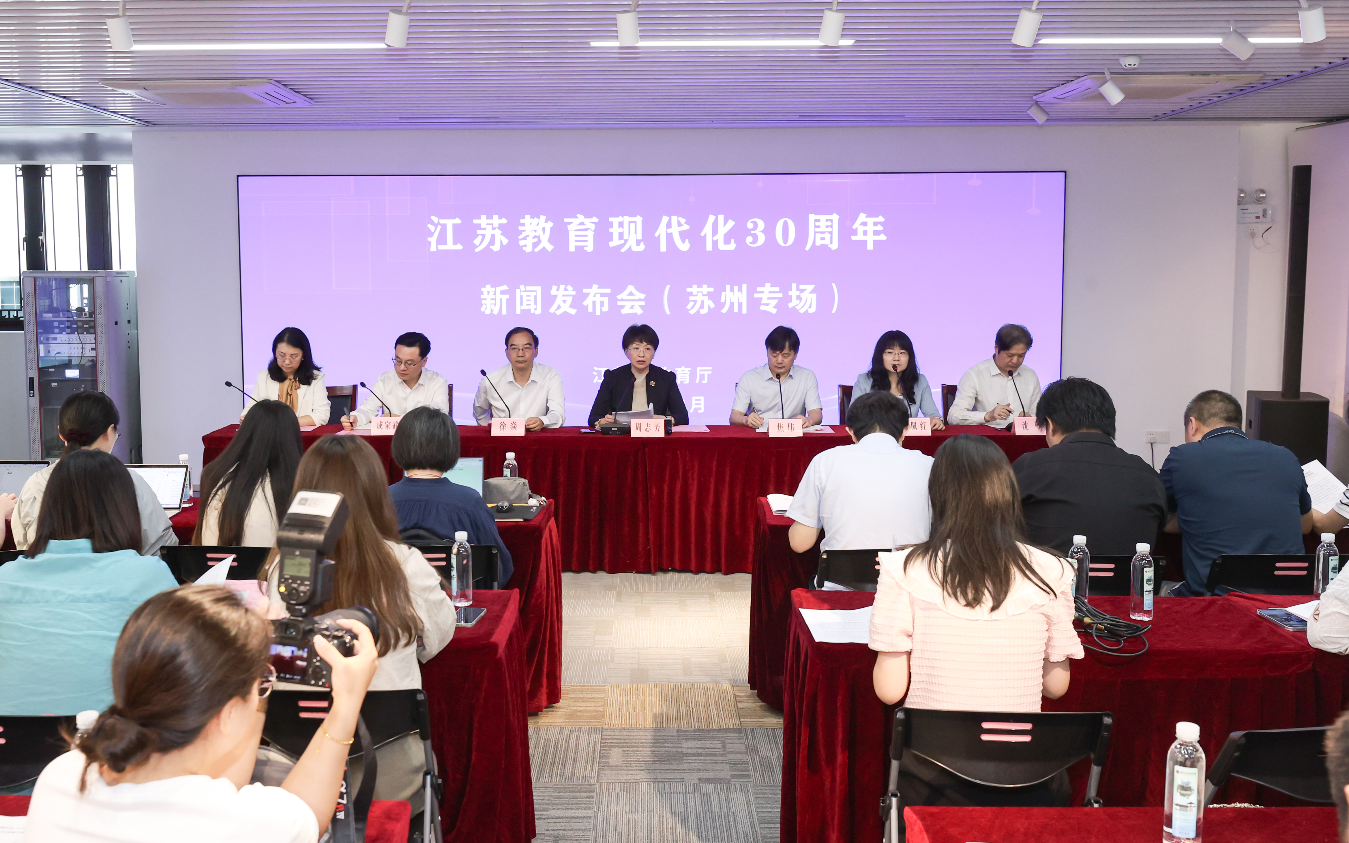 为深入学习贯彻党的二十大精神和习近平总书记对江苏工作的重要讲话精神,全方位、多层面、立体化解读和展示江苏推进教育现代化和教育强省建设,特别是苏南地区实施教育现代化工程30年来的先进做法和经验启示,省教育厅将在全省各地组织举行“江苏教育现代化30周年”系列专场新闻发布会。9月14日 ,苏州专场新闻发布会在苏州教育博物馆举行。省教育厅办公室(新闻办)主任焦伟主持发布会,苏州市委教育工委书记、市教育局局长周志芳作综合发布。