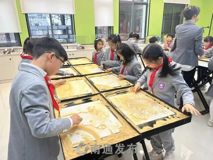 在学校沙画社团活动上,南通市紫琅第一小学二(13)班学生黄何小心地掬一把沙子,慢慢撒在沙盘上,用手指仔细地描出叶子、莲蓬……看着荷花图慢慢呈现于指端,她开心不已。这是央媒、省媒记者在南通开展集中采访活动看到的一个场景。