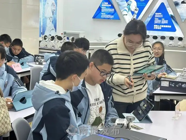输入指令、模块拼搭、机器人执行……在江苏省南通中学附属实验学校的AI社团里,学生们的科学素养令人惊叹。“我们课堂是开放的,家长在公众号上预约,随时可以来听课,检查课堂效果。”该校校长蓝寿军的介绍令记者们感到惊奇。