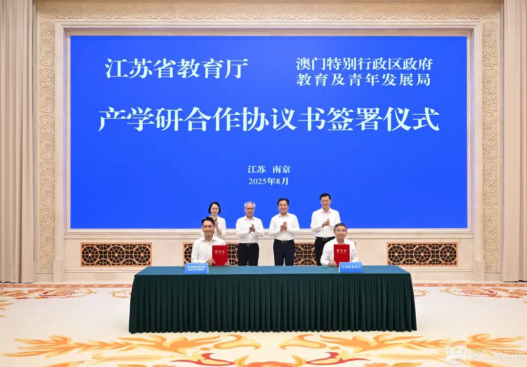 会见后,江苏省教育厅与澳门特别行政区政府教育及青年发展局签署了推动产学研合作协议书。